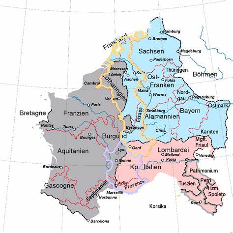 Nell’843, con il trattato di Verdun l’impero viene diviso in tre parti: regno dei Franchi occidentali, regno dei Franchi orientali e il cosiddetto regno franco medio, che comprende una parte oltralpe, nota come Lotaringia, e il regno d’Italia, corrispondente all’Italia del Nord. A quest’ultimo regno viene associato il titolo imperiale.